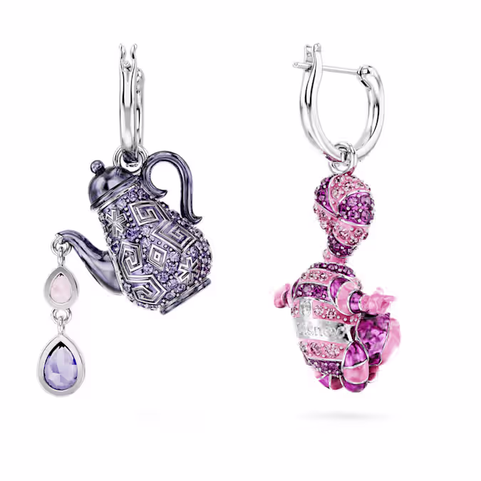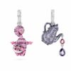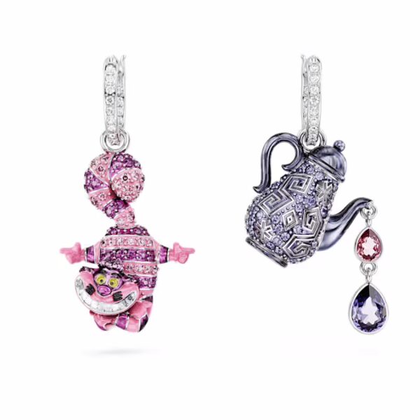 Эти яркие и игривые мини-кольца оживляют персонажей Disney. Асимметричная пара включает ухмыляющегося Чеширского кота, созданного в различных розовых тонах, а также фиолетовый опрокидывающийся чайник, который волшебным образом выливает два грушевидных кристалла. Каждая серьга установлена на мини-кольце с родиевым покрытием, украшенном прозрачными кристаллами. Совершенно любопытный способ повеселиться со своим стилем.