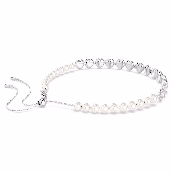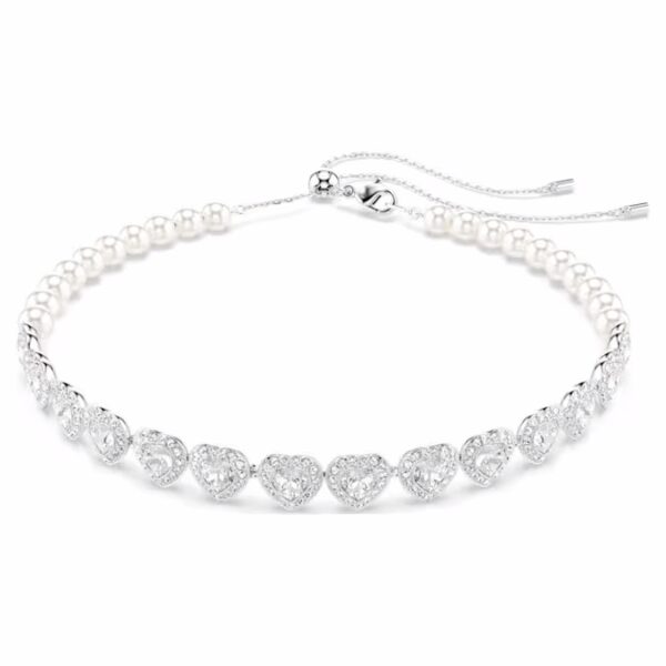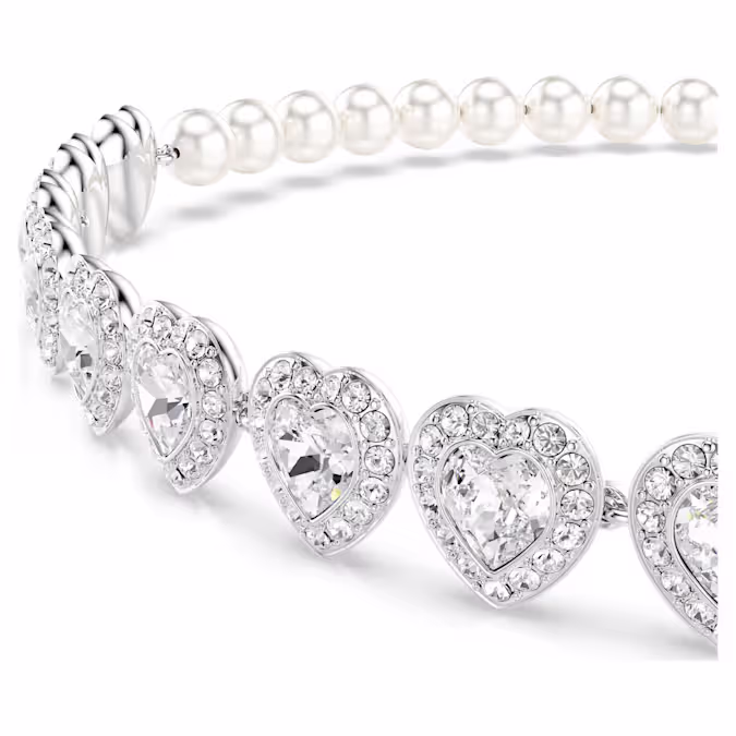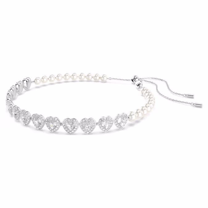 Это сияющее колье было создано для интенсивного выражения любви. Покрытый родием дизайн частично украшен роскошными кристальными жемчужинами Swarovski, а спереди находится ряд кристаллов в форме сердца, каждый из которых окружен сверкающим ореолом прозрачного паве. Скользящая застежка сзади позволяет вам отрегулировать украшение по своему вкусу. Сочетайте это смелое ожерелье с другими подходящими украшениями, чтобы создать собственные романтические комбинации.