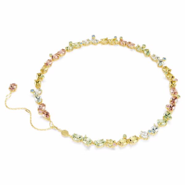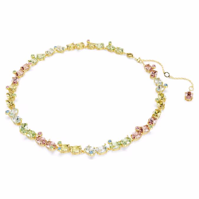 Это ожерелье Gema с яркими цветами и сверкающими отблесками поистине олицетворяет радость. Это украшение с покрытием золотого оттенка украшено крупными кристаллами насыщенных оттенков, а также более мелкими кристаллами в игривой оправе с эффектом пузырьков. Яркое и динамичное украшение, которое подарит вам хорошее настроение на самые яркие дни.