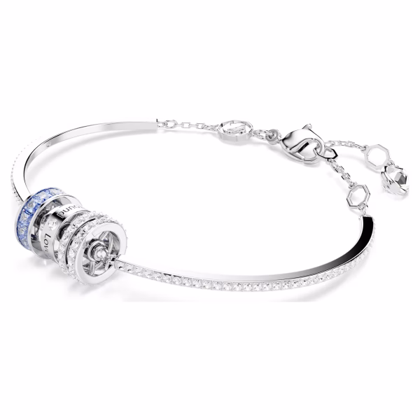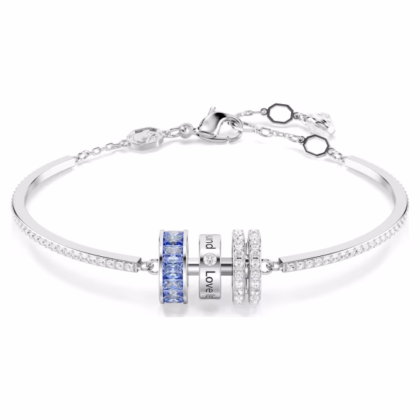 Дизайн с родиевым покрытием состоит из одной рондели из голубых цирконов Swarovski багетной огранки, другой инкрустирована прозрачными кристаллами, а на третьей выгравирована надпись «Любовь рядом». Браслет дополнен кристаллизованной полосой и скользящей застежкой. Подарите этот браслет тому, кто занимает особое место в вашем сердце.