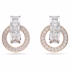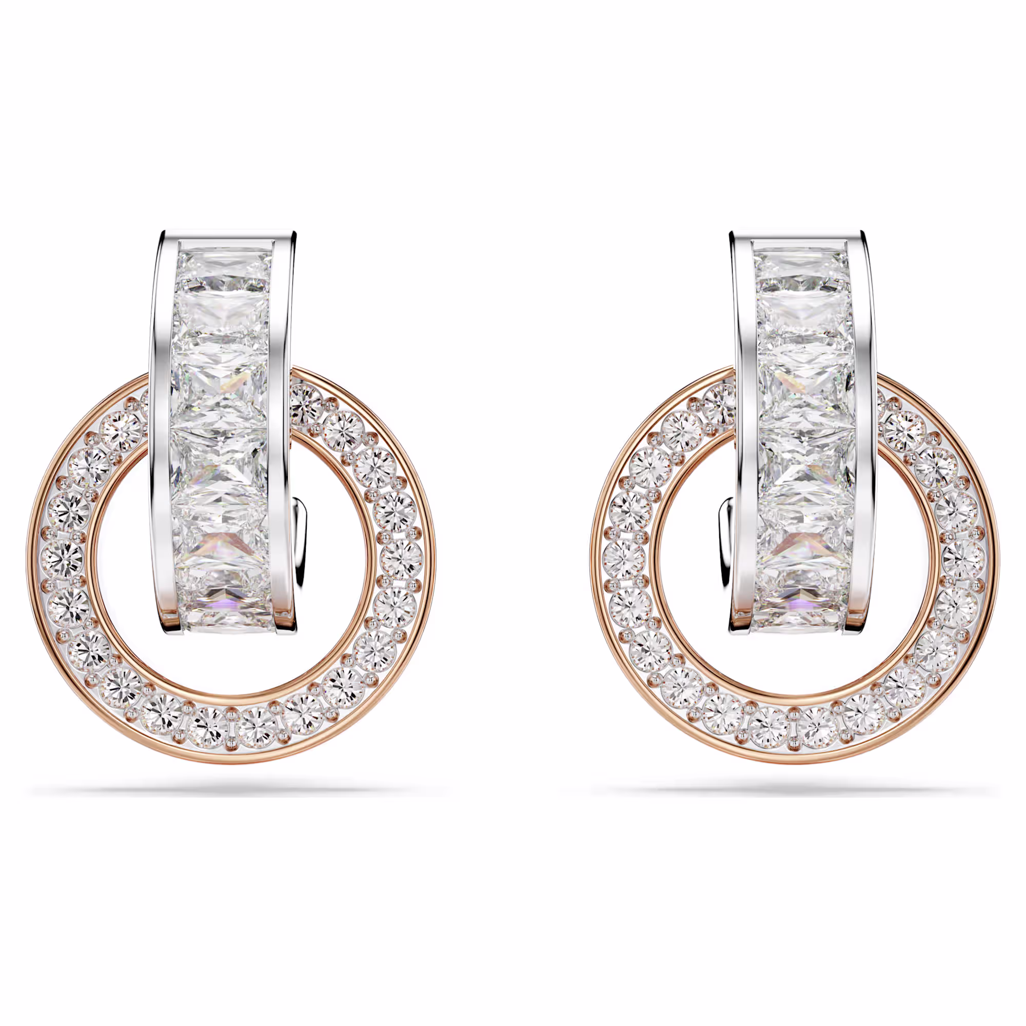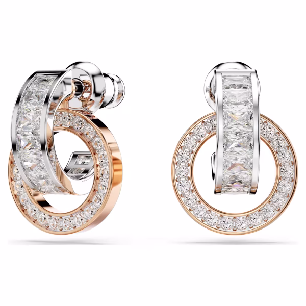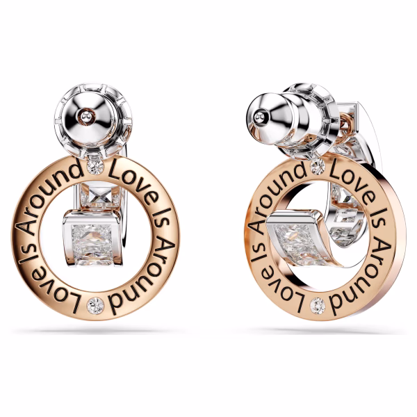 Носите их как единое целое: половинчатые серьги с родиевым покрытием, украшенные цирконами Swarovski багетной огранки, или же прикрепите двусторонние серьги-кольца цвета розового золота, на одной стороне которых находится прозрачное паве, а на другой – выгравировано скрытое послание «Любовь рядом». Уникальный подарок или игривое дополнение к вашей собственной коллекции украшений.