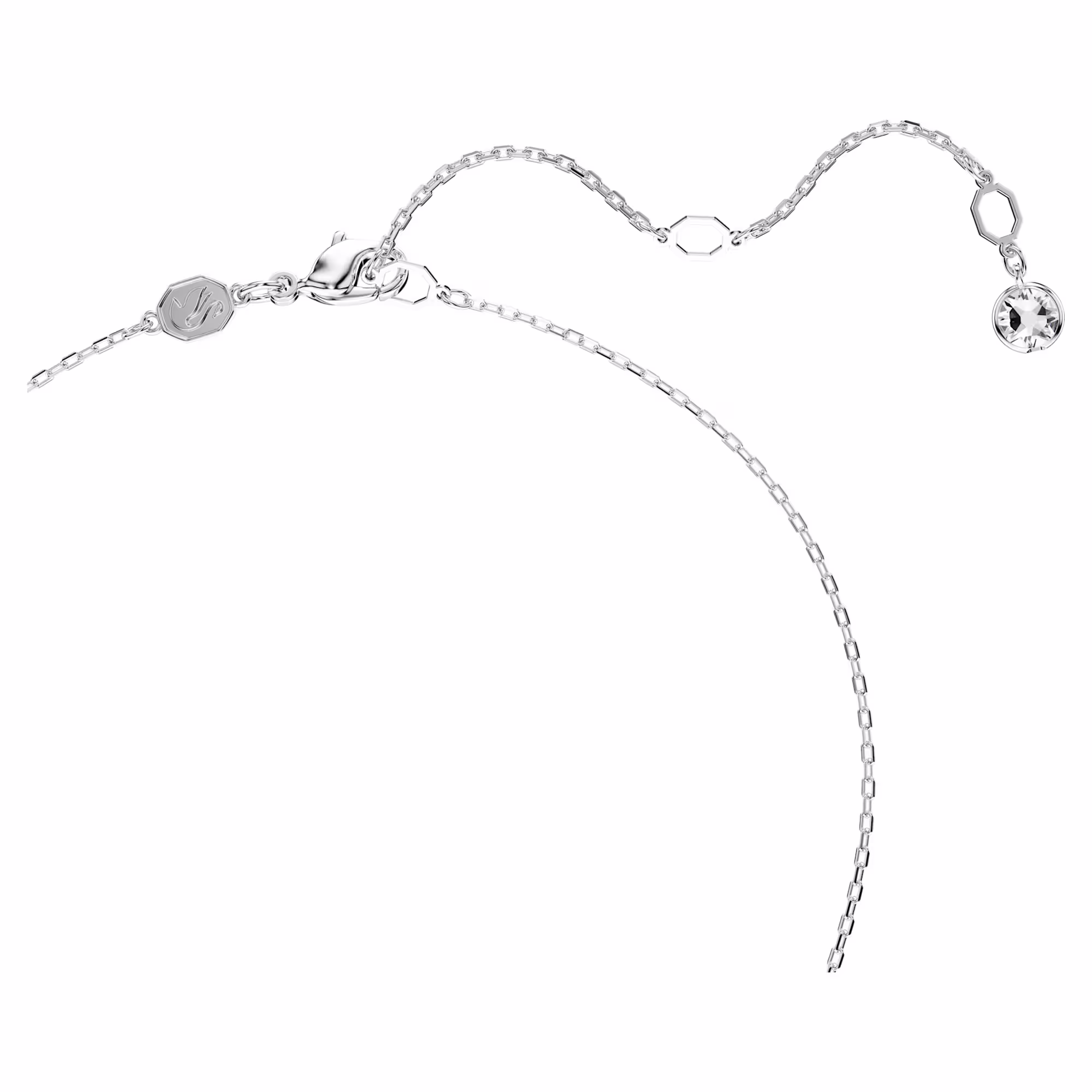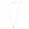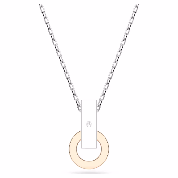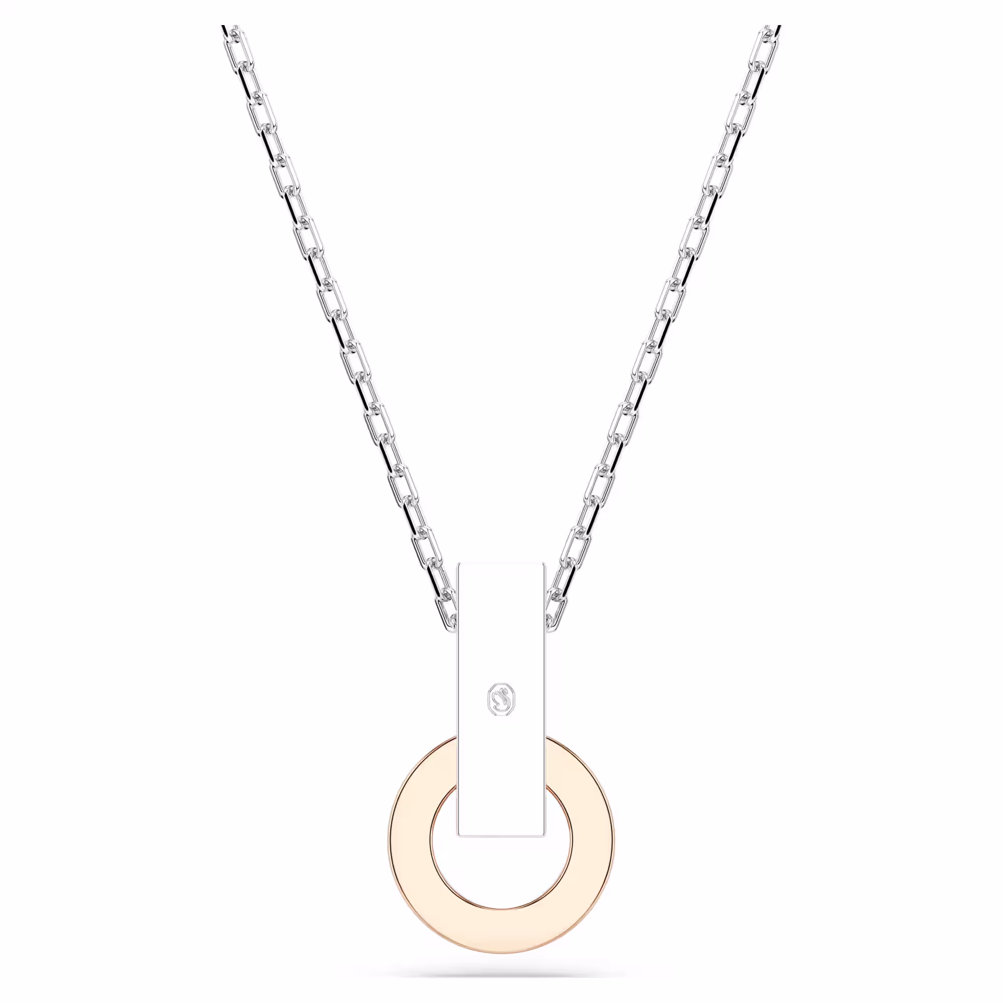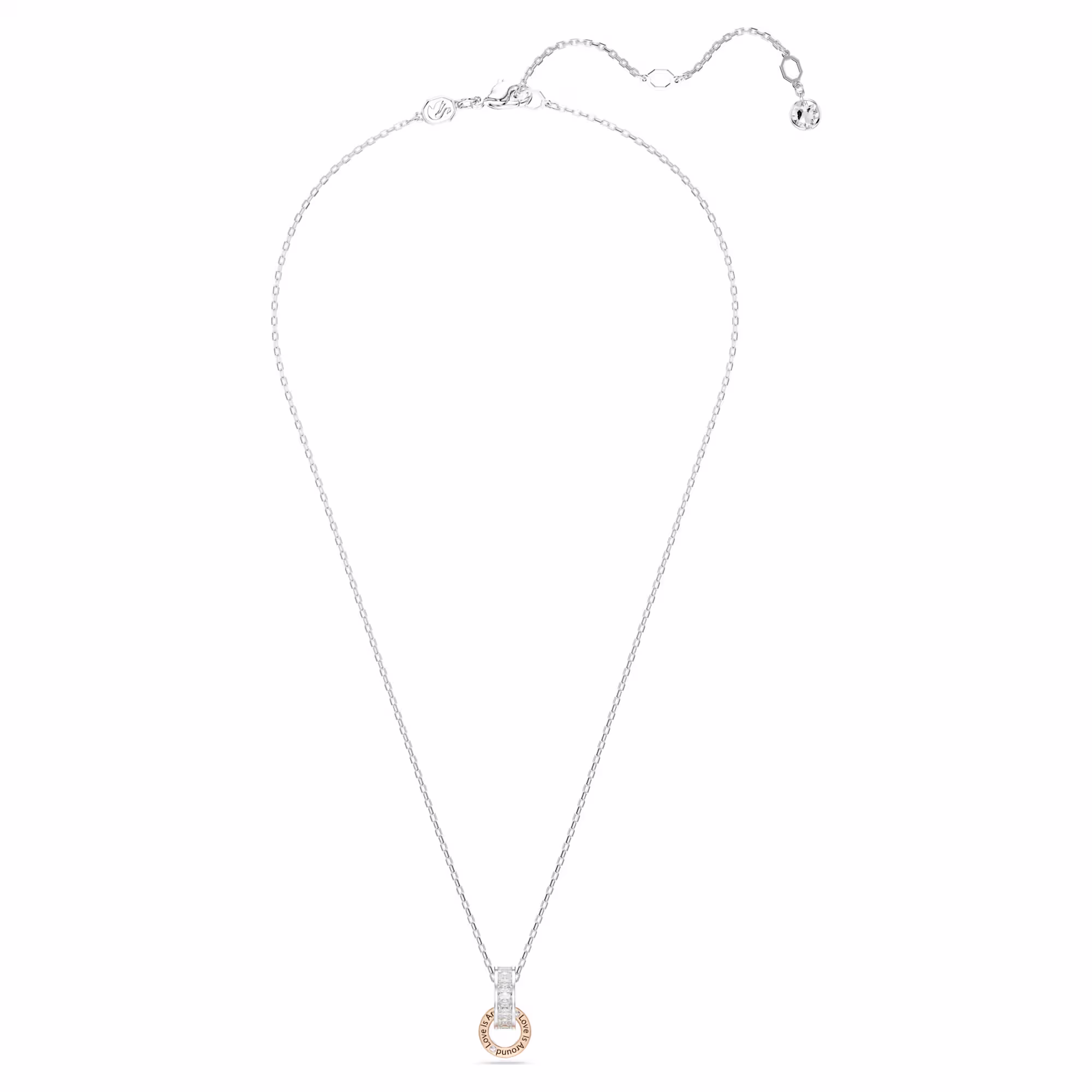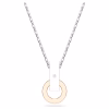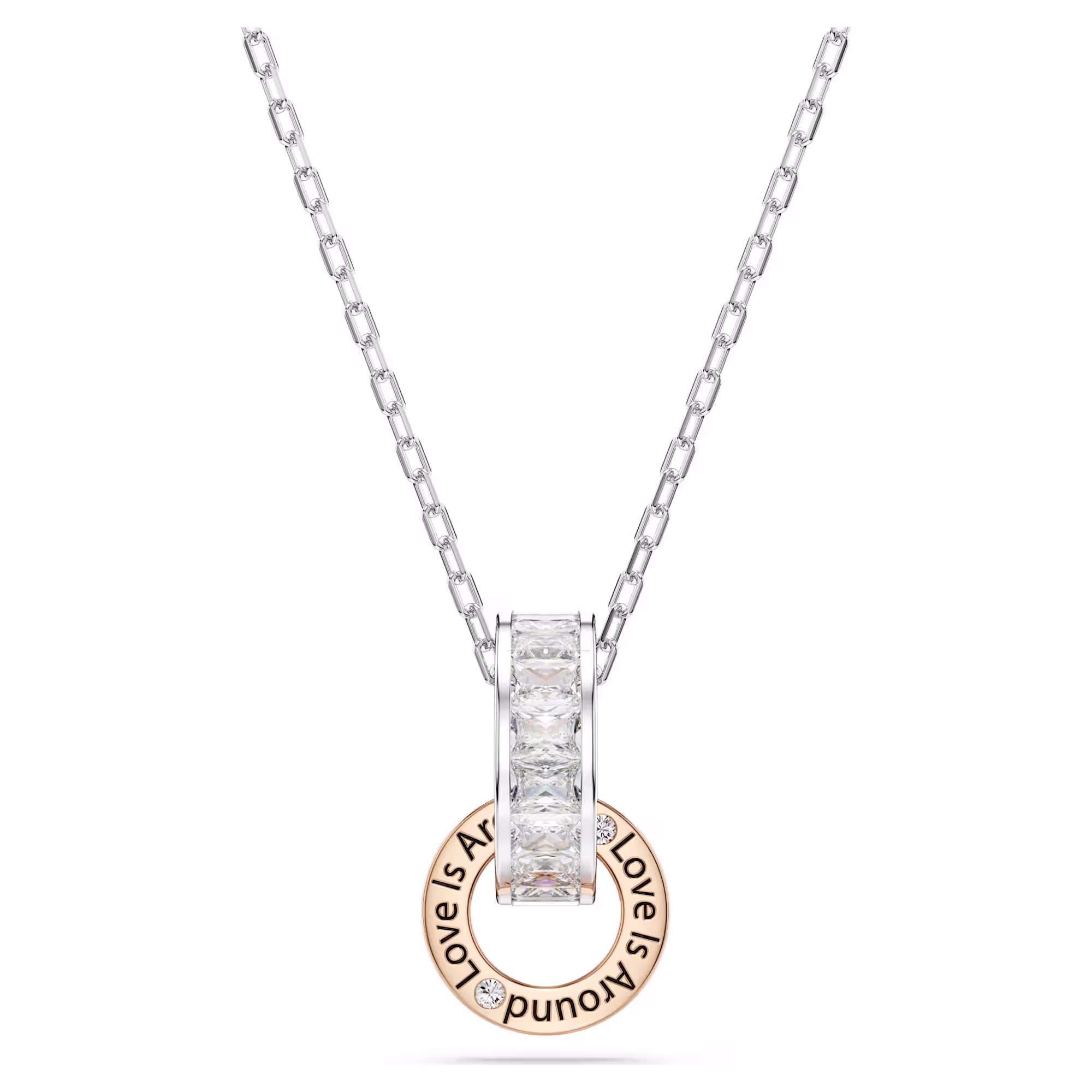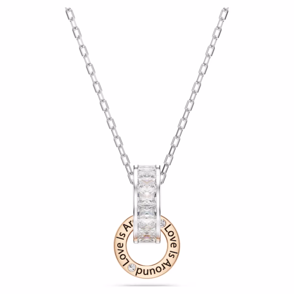 Подвешенный на родированной цепочке с застежкой-карабином, дизайн включает в себя полуродированное кольцо, украшенное прозрачными цирконами Swarovski багетной огранки, переплетенное с кольцом с покрытием из розового золота, на котором выгравирована надпись «Любовь рядом». Вечное отражение ваших истинных чувств.