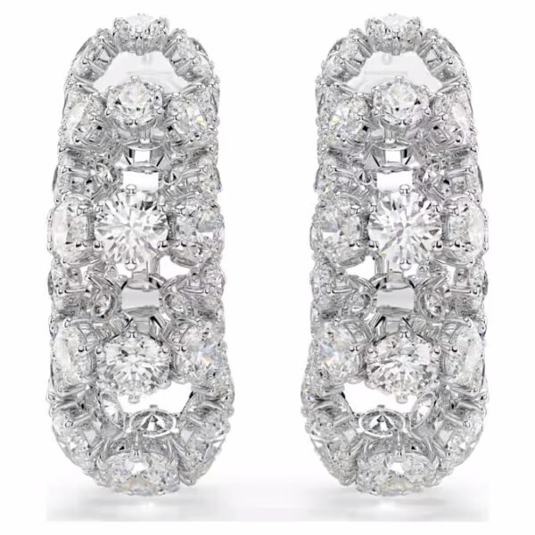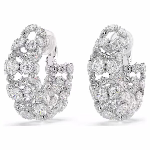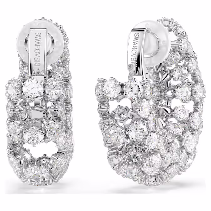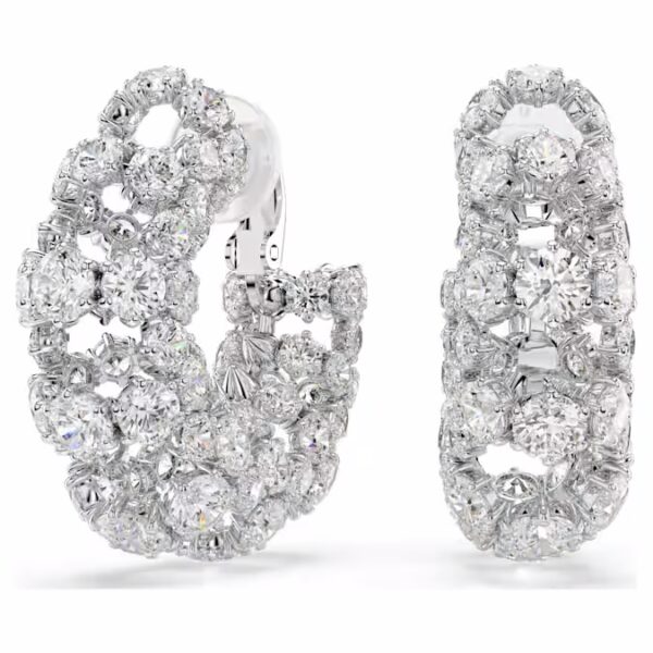 Взаимодействие света является основой дизайна этих завораживающих сережек-клипс. Каждое покрытое родием изделие демонстрирует несколько круговых лучей круглой огранки Swarovski Zirconia, объединяясь для смелого примера межзвездного гламура. Носите с соответствующим чокером Constella для максимального сияния.