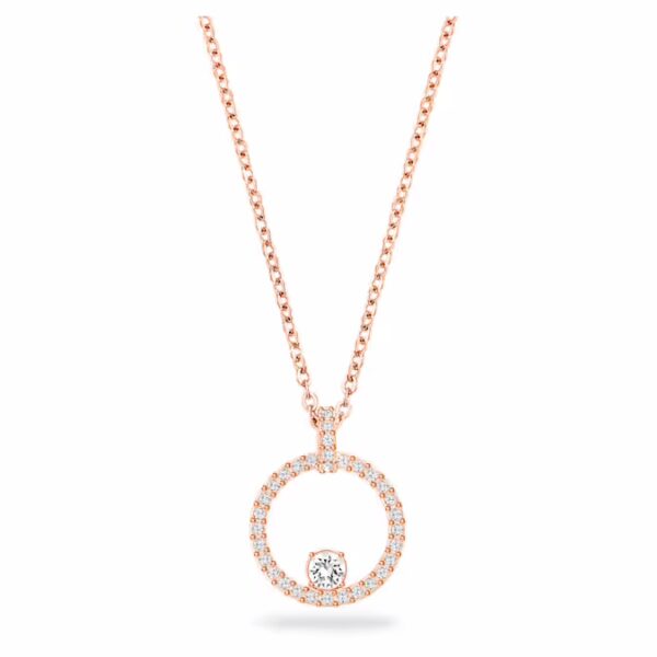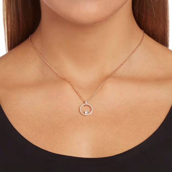 Потрясающая новая интерпретация вечной классики: круглая подвеска. Этот изысканный дизайн сверкает прозрачным кристальным паве. Металл с розовым золотом добавляет современный штрих. Носите с более длинной подвеской для создания модного многослойного образа. Подвеска имеет размеры 1,5 x 2 см и поставляется на цепочке длиной 38 см.