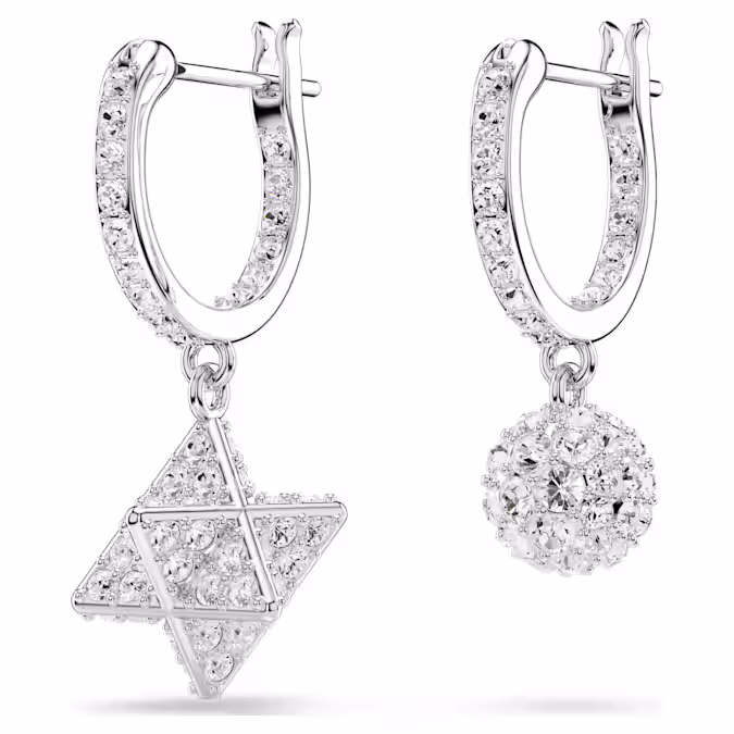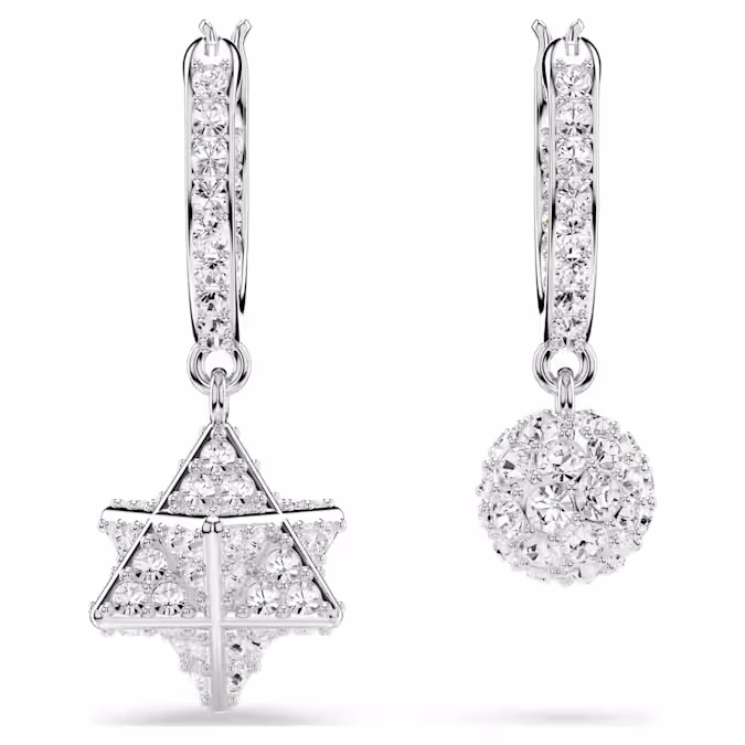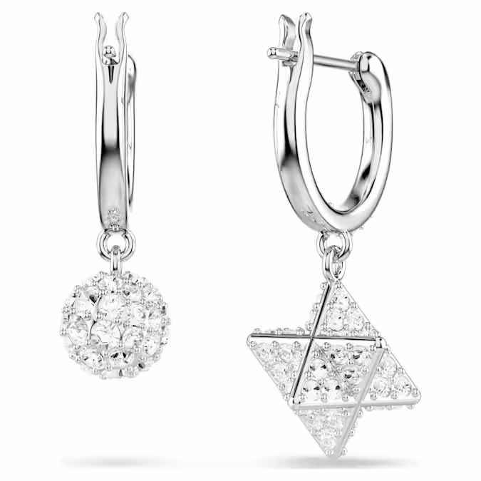 Эти замысловатые проколотые серьги подчеркивают прекрасное взаимодействие света и геометрии. Этот асимметричный комплект включает в себя 3D-звезду и сферу с родиевым покрытием, каждая из которых прикреплена к мини-кольцу и украшена паве из мерцающих прозрачных кристаллов. Уникальный комплект, который обязательно вдохновит воображение.