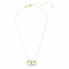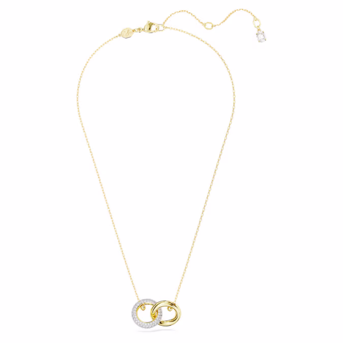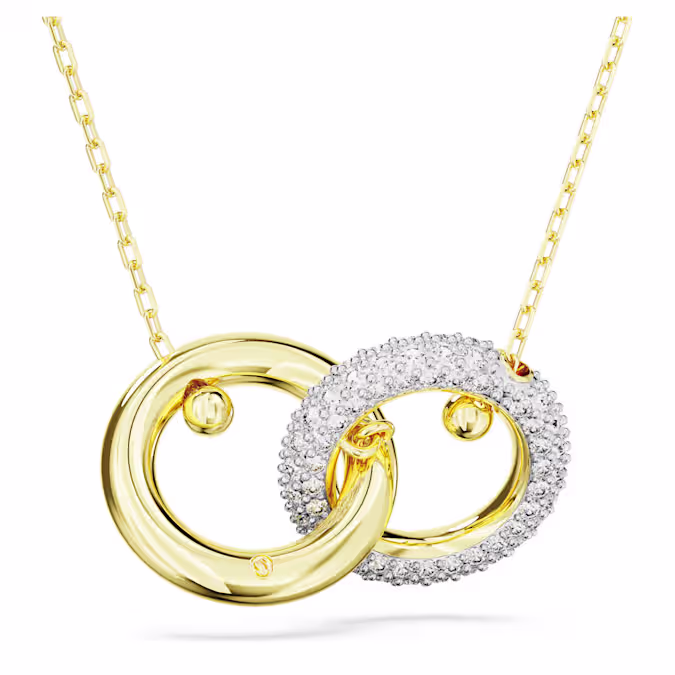 Ощутите дух единства с этим кулоном из семейства Dextera. Позолоченный дизайн с двумя взаимосвязанными трубчатыми кольцами, одно из которых мерцает паве по всей поверхности. Изящная цепочка включает один цирконий Swarovski, украшающий конец для дополнительной роскоши. Сочетая смелые формы с сияющими прозрачными кристаллами, это завораживающее изделие максимально подчеркнет ваш стиль.