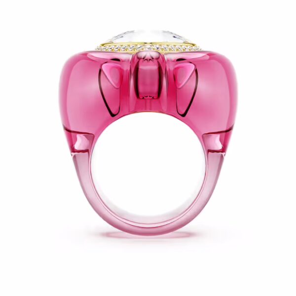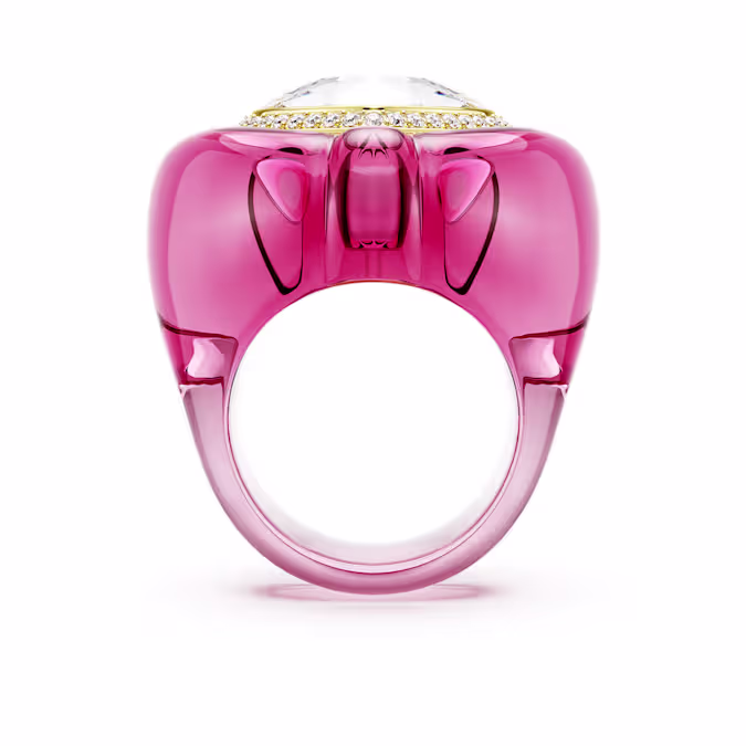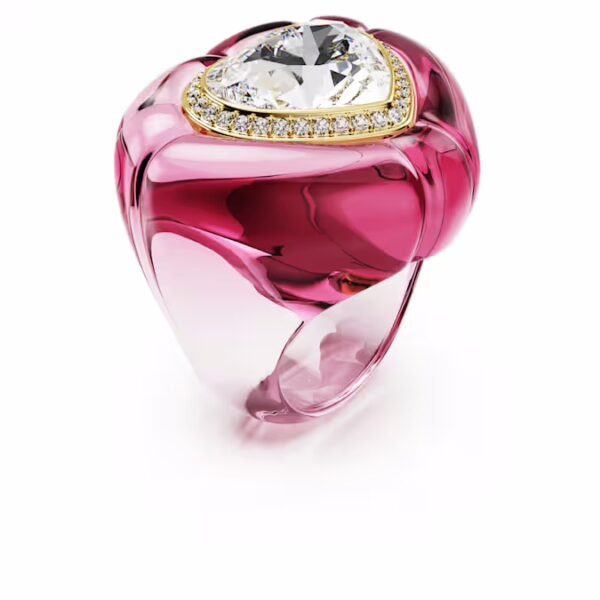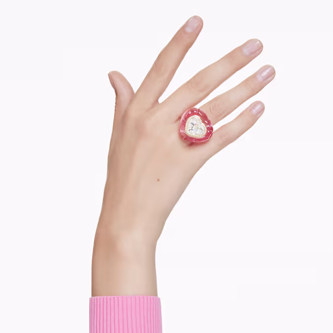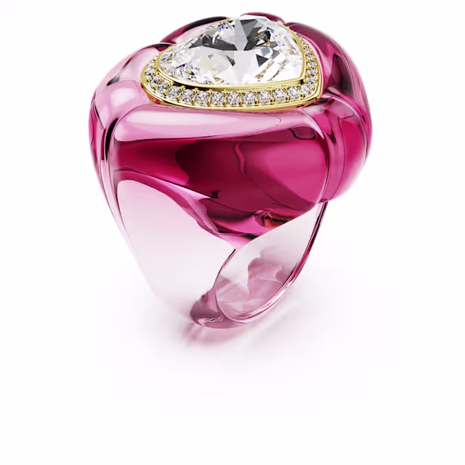 Вдохновленное радостью движения поп-арт, это коктейльное кольцо — игривый способ раскрасить свой стиль. Розовая полоса в форме сердца сочетается с прозрачным кристаллом в форме сердца, окруженным прозрачным паве в позолоченной оправе. Носите его в любое время для яркой вспышки яркости или выражайте свою креативность, сочетая его с другими коктейльными кольцами из семейства Dulcis.