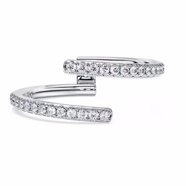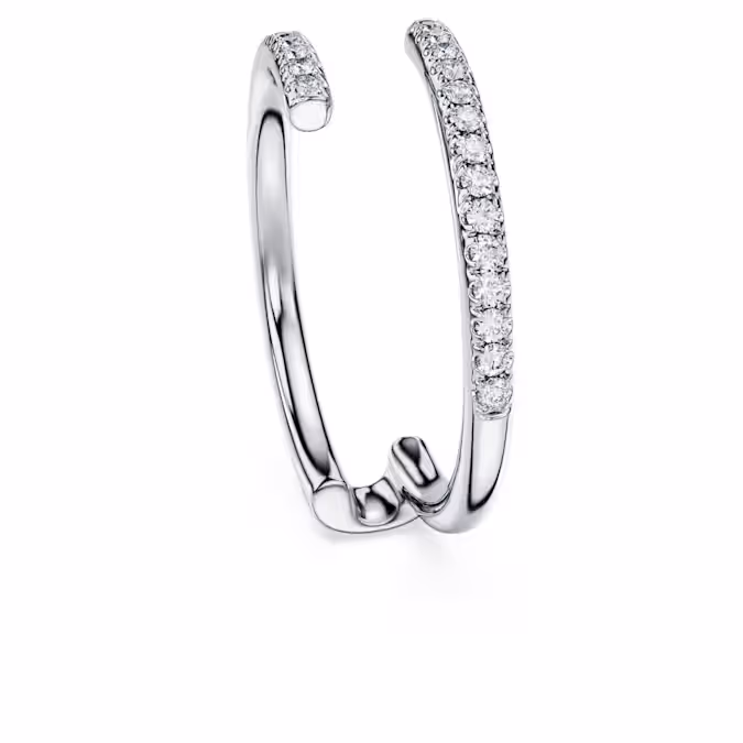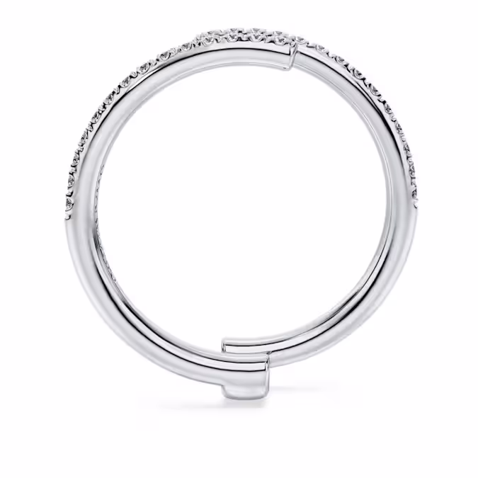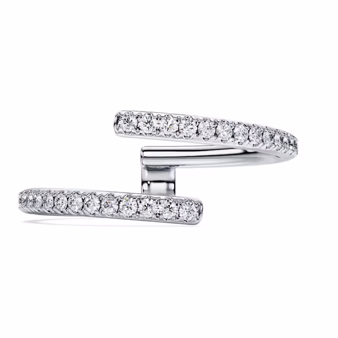Это несравненное кольцо Eternity сочетает в себе уникальную форму и сверкающую красоту. Кольцо из 14-каратного белого золота имеет открытый двойной дизайн с равномерными рядами круглых лабораторно выращенных бриллиантов общим весом 0,2 карата. Идеально подходит для нашего асимметричного кольца-солитера. Это украшение сертифицировано IGI (Международным геммологическим институтом) и является частью коллекции Eternity.
