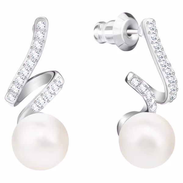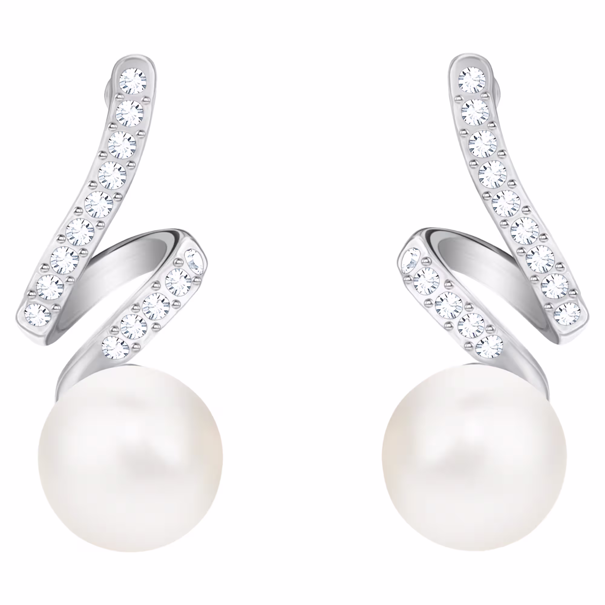Потрясающей пары родированных сережек-гвоздиков. Обладая роскошным сиянием, они станут идеальным подарком. Изящно сбалансированный дизайн демонстрирует знаменитое мастерство Swarovski: сверкающие жемчужины Crystal Pearls, обрамленные тонкими спиралями паве. В наличии также соответствующий кулон.