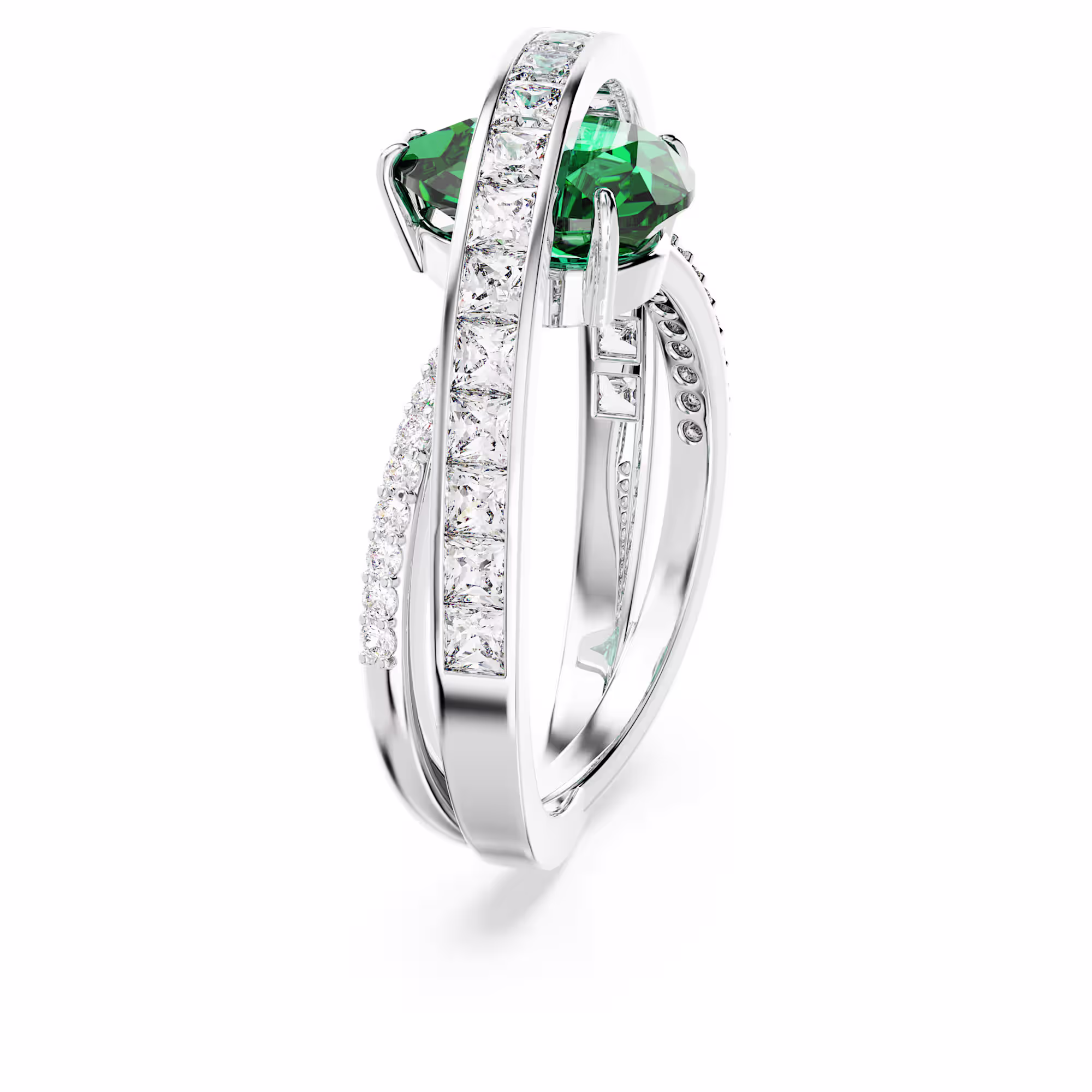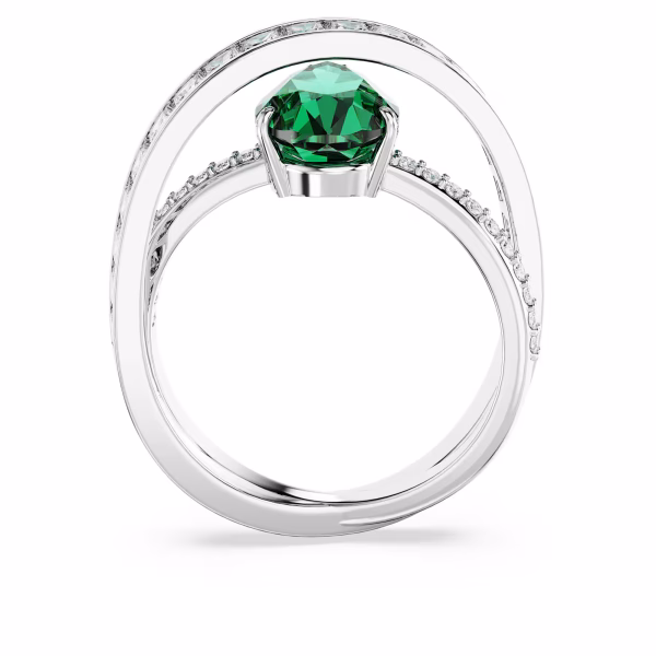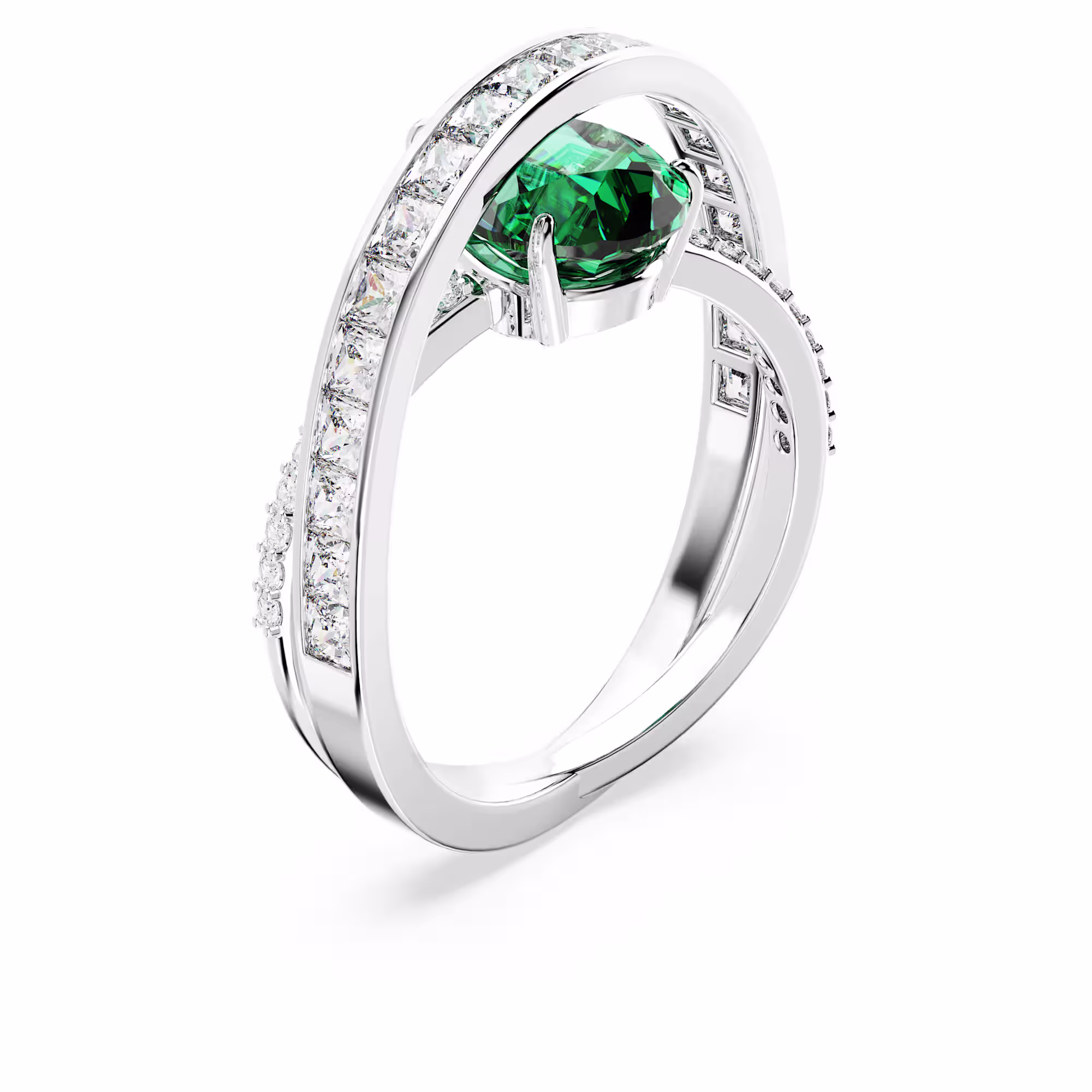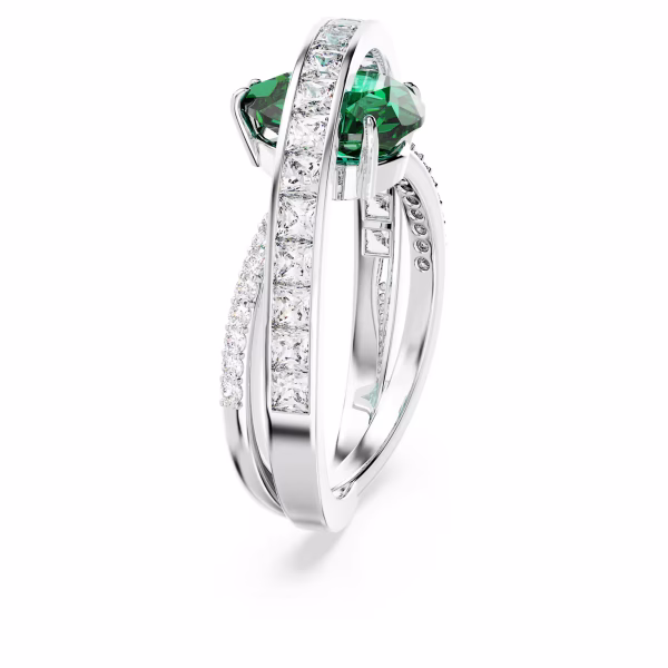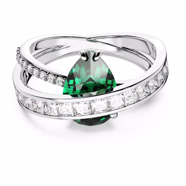 «Hyperbola» — воплощение смелого шика. Дизайн с родиевым покрытием представляет собой двойную спираль из полос, каждая из которых украшена сверкающим паве различных огранок. В центре кольца расположен зеленый камень грушевидной огранки, демонстрирующий исключительную детализацию и утонченную закрепку. Идеальное кольцо для ношения как отдельно, так и в сочетании с серьгами.