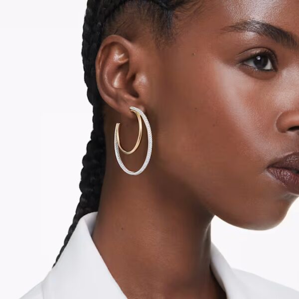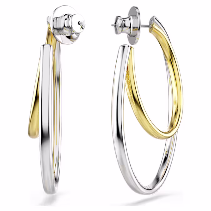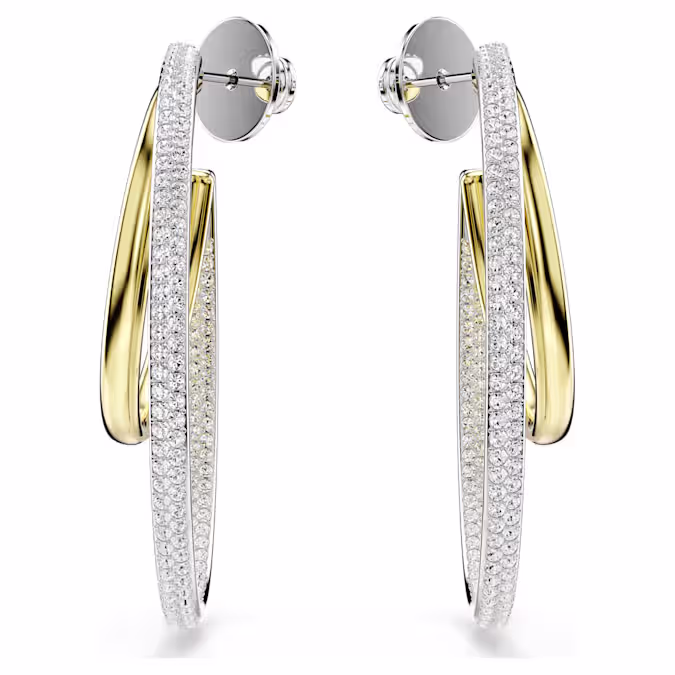 Эти серьги-гвоздики Hyperbola с несколькими металлическими покрытиями легко бросаются в глаза. Каждая сторона имеет небольшой позолоченный обруч внутри большого родированного обруча, украшенного прозрачными цирконами Swarovski. Завораживающий ажурный дизайн, который поднимет ваш повседневный образ.
