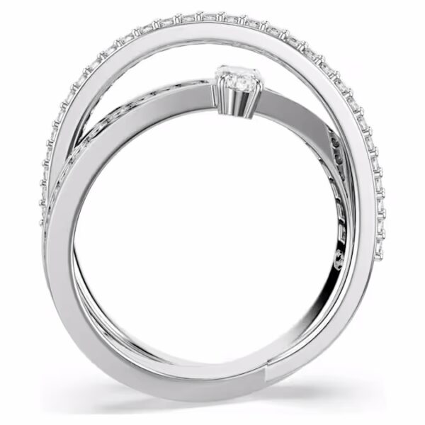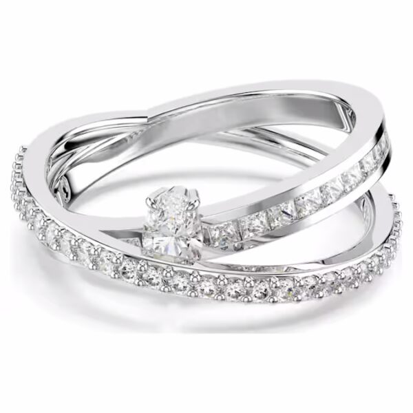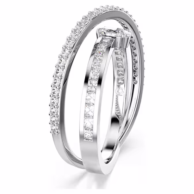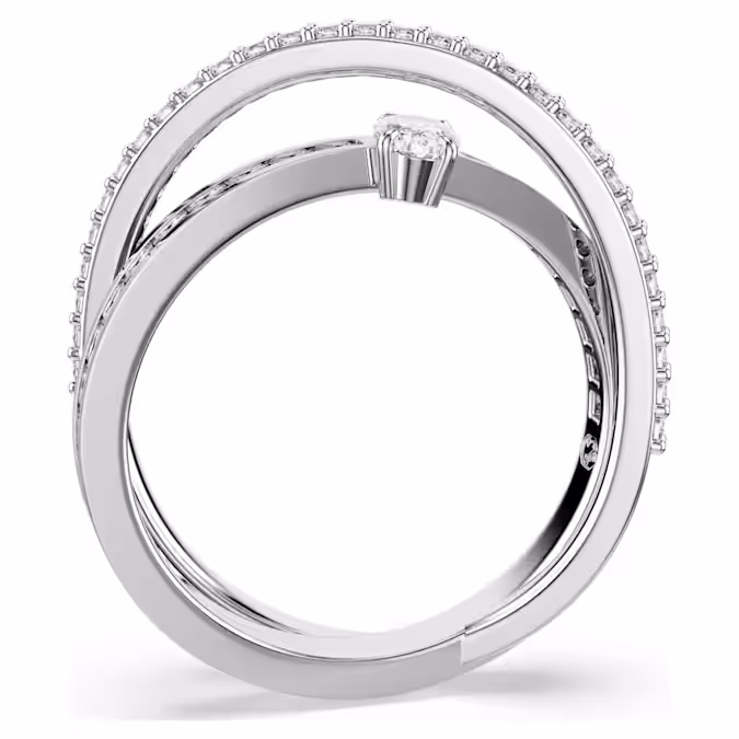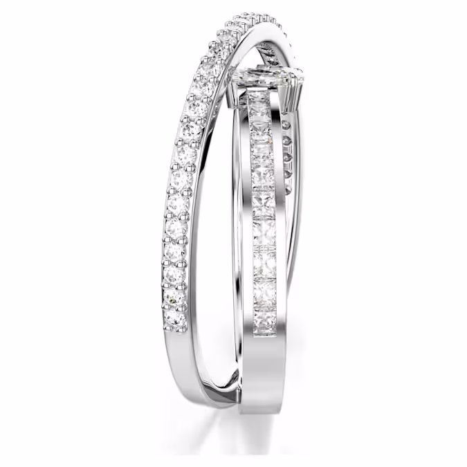 Это скручивающееся кольцо Hyperbola объединяет несколько стилей в одном красивом компактном дизайне. Его две перекрывающиеся полосы с родиевым покрытием украшены прозрачными цирконами Swarovski в канальных и зубчатых оправах. Дополнительный кристалл овальной огранки помещен между ними для дополнительного эффекта. Сочетайте с соответствующим браслетом для действительно эффектного образа.