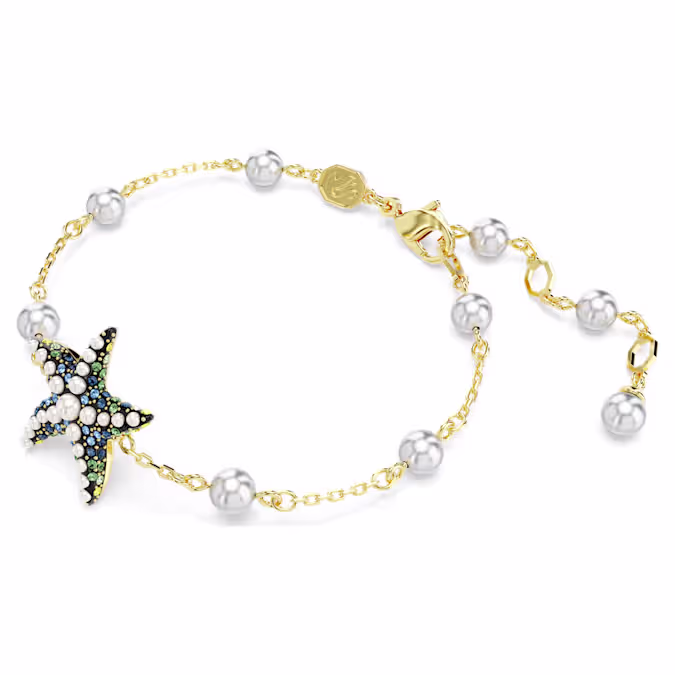Окружите свое запястье духом океана благодаря этому креативному браслету Idyllia. Цепочка с золотым покрытием украшена светло-серыми кристальными жемчужинами и имеет мотив морской звезды в центре, который был красиво украшен разнообразными белыми кристальными жемчужинами и ослепительными кристаллами в морских цветах. Игривое и яркое дополнение к любой вашей одежде.