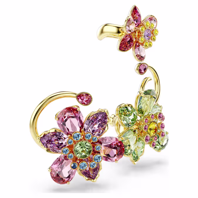 Эти яркие и красочные серьги, пришедшие прямо из волшебного сада чудес Идиллии, являются чистым выражением радости. Каждое изделие покрыто золотом, с цветами, созданными из ярких кристаллов различных форм и оттенков. В наборе из трех вы можете носить две серьги-гвоздики по отдельности или сочетать их с серьгой-каффом для энергичного образа. Идеальный способ привнести в свой стиль очаровательный штрих природы.