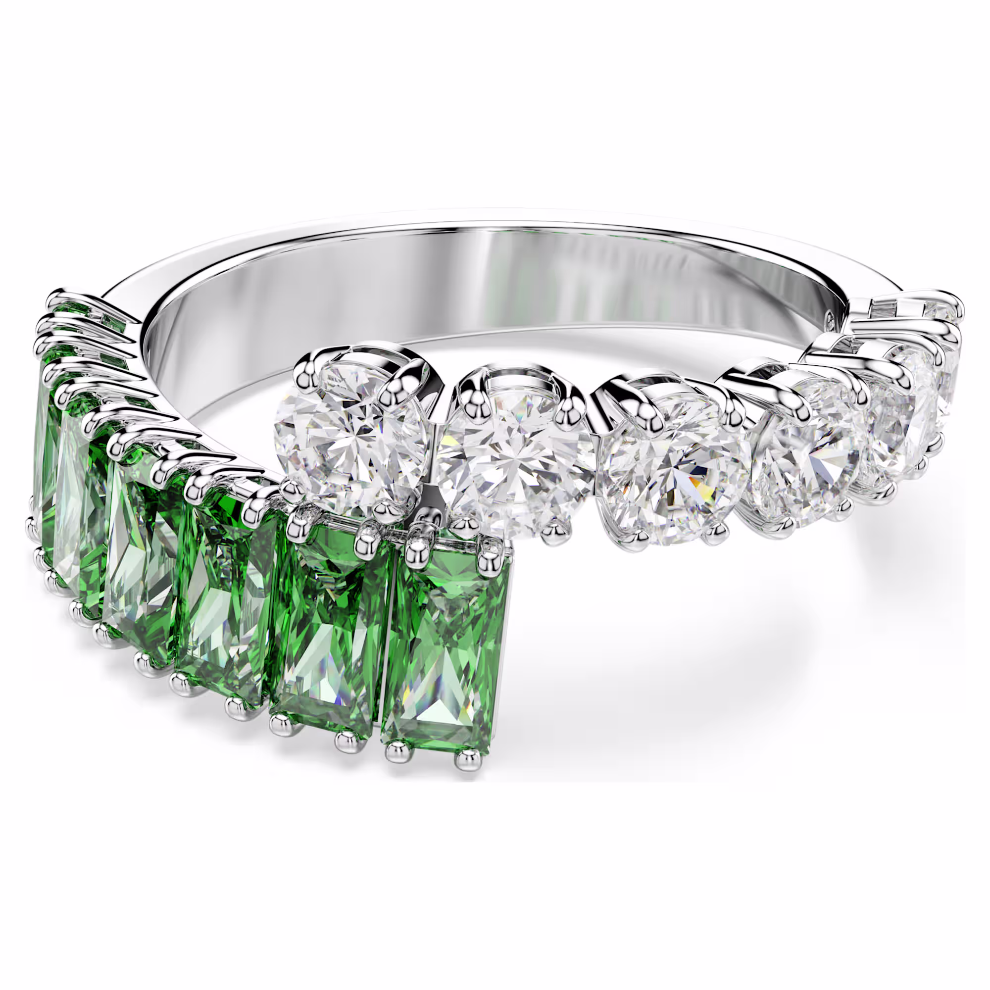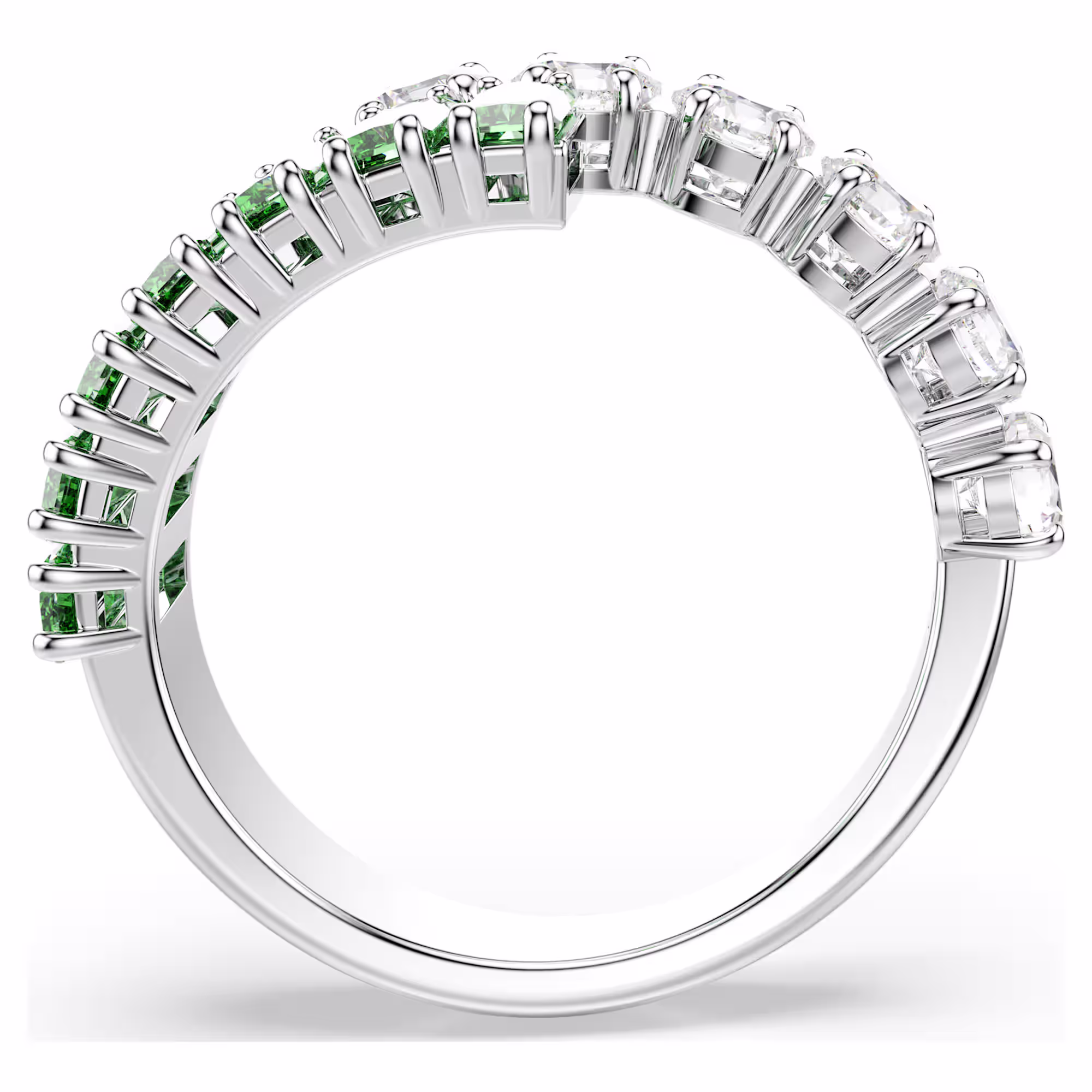 Это завораживающее кольцо-ободок представляет собой сочетание цветов и форм. Перекрывающаяся полоса покрыта родием и украшена прозрачными и зелеными цирконами Swarovski круглой и багетной огранки. Яркий выбор, который прекрасно сочетается с соответствующим браслетом и серьгами.