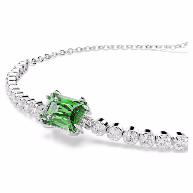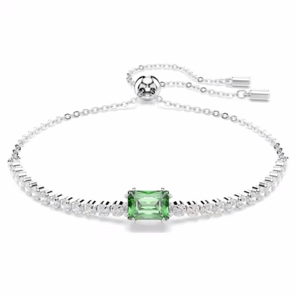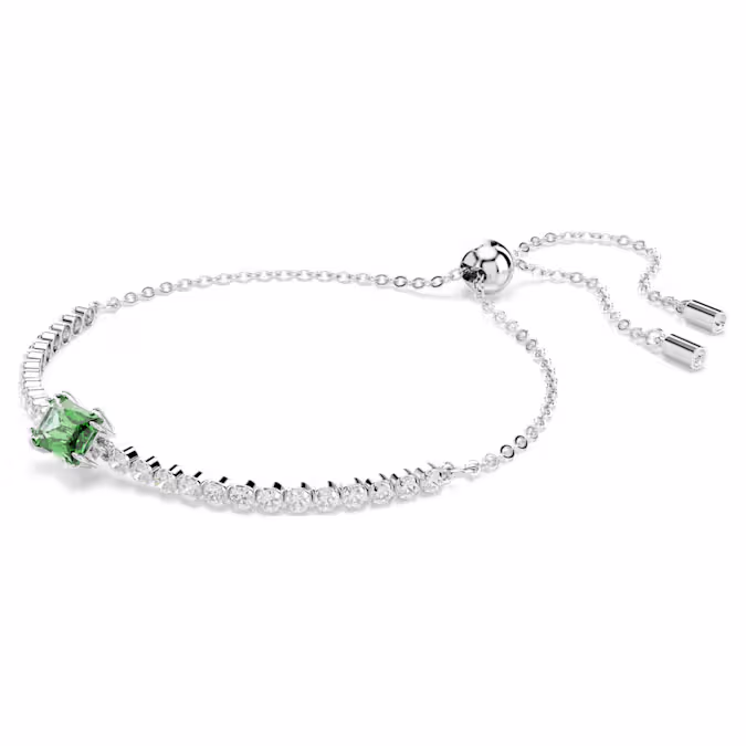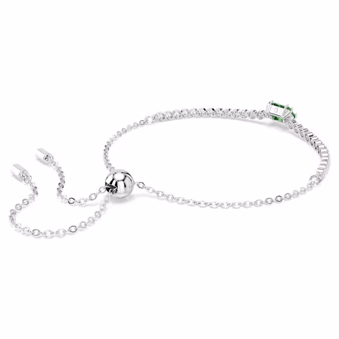 Этот классический теннисный браслет, добавляющий сияния любому образу, сочетает в себе прозрачные фианиты Swarovski с ярким цветом. Застегивающееся на скользящую застежку, родированное украшение имеет равномерный ряд прозрачных фианитов Swarovski и акцентировано зеленым фианитом Swarovski багетной огранки в центре. Яркий поворот в стиле, неподвластном времени.