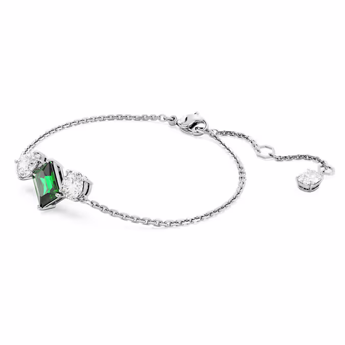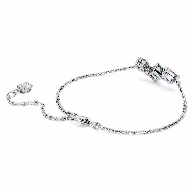 Подчеркнутый яркими цветами, этот браслет Mesmera готов произвести впечатление. Покрытый родием дизайн носится на изящной цепочке с подвесным удлинением и имеет трио циркония Swarovski в зубчатой оправе разных форм, включая центральный восьмиугольный ступенчатый камень зеленого цвета. Смелое сочетание огранок, которое станет чудесным подарком.