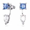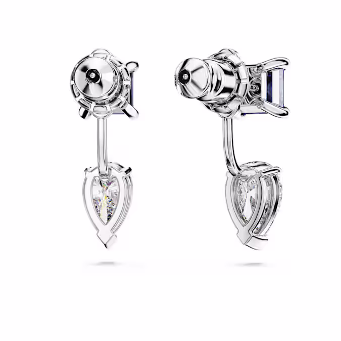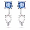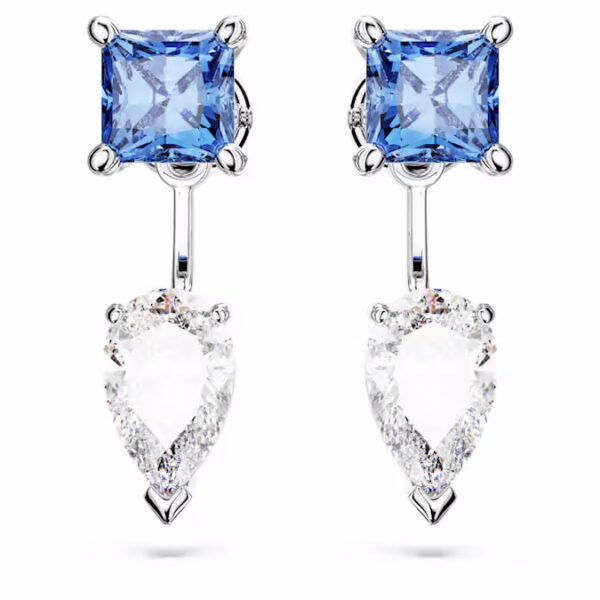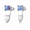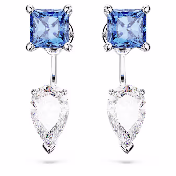 Эти привлекательные серьги Mesmera — универсальный и завораживающий выбор. Проколотый дизайн покрыт родием и украшен парой фианитов Swarovski в зубчатой ​​оправе в грушевидной и квадратной огранке. Носите их как отдельные синие гвоздики или отрегулируйте высоту съемной капли грушевидной огранки в соответствии со своим стилем. Идеальный подарок, чтобы придать любому вечернему наряду элегантность и цвет.