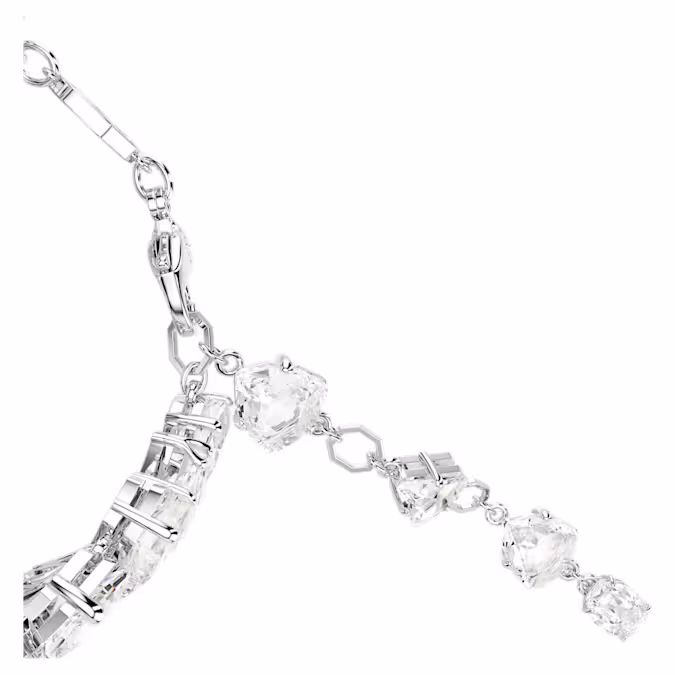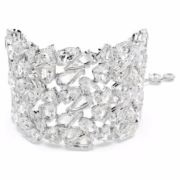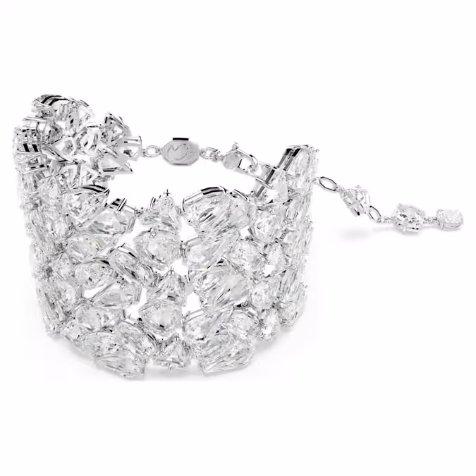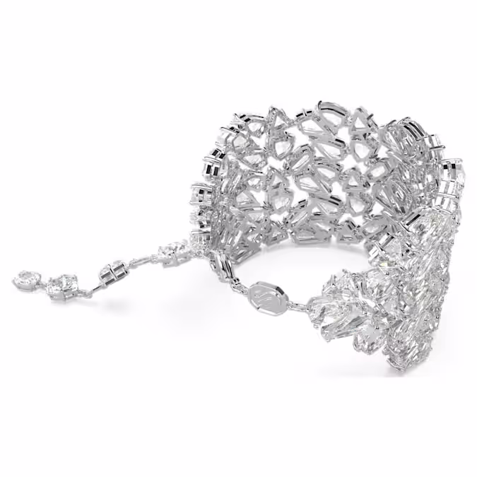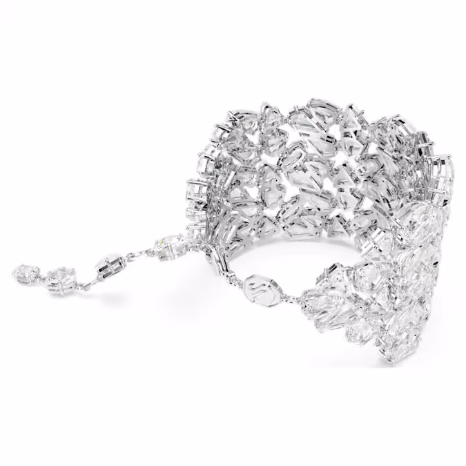 Этот необычный браслет Mesmera — эффектное украшение, которое мгновенно улучшит ваш вечерний стиль. Смелый дизайн покрыт родием и отличается привлекательным скоплением кристаллов в драматическом разнообразии огранок. Для дополнительной роскоши подвесное удлинение включает отдельные цирконии Swarovski между каждым восьмиугольным звеном. Благодаря такому количеству граней на виду это изделие ловит свет со всех сторон. Выберите этот браслет как высшее выражение изысканности.