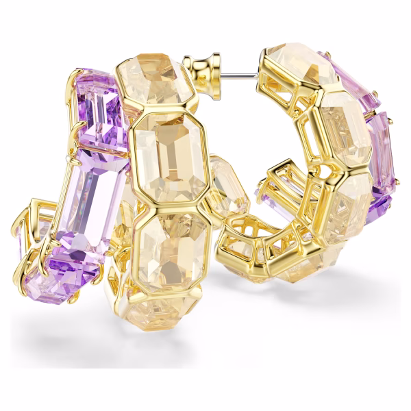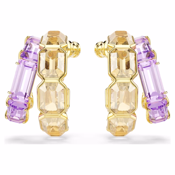 Эти разноцветные серьги — идеальный выбор для создания по-настоящему гламурного образа. Каждое позолоченное украшение состоит из двух асимметричных мини-колец, в каждом из которых в оправе закреплены восьмиугольные карамельные кристаллы, а в закрепке — фиолетовые кристаллы. Прекрасное сочетание контрастов, создающее смелый образ. Носите эти серьги с другими украшениями из той же серии, чтобы подчеркнуть эффект.