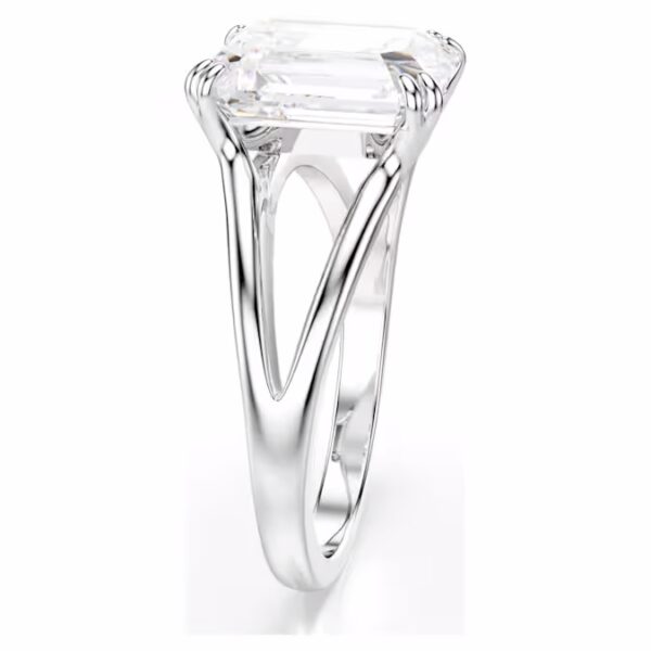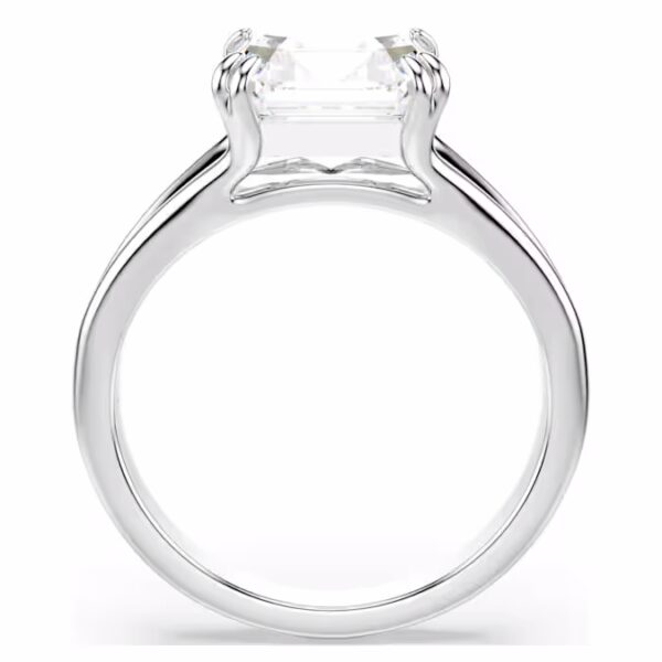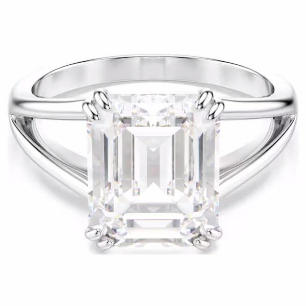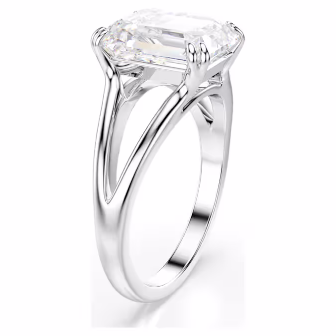 Добавьте гламура с этим сияющим коктейльным кольцом. Дизайн с отделкой серебристого тона включает в себя разделенную полосу с восьмиугольным цирконием Swarovski в центре, закрепленным на месте с помощью изысканной двойной закрепки. Потрясающее украшение, которое сверкает.