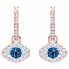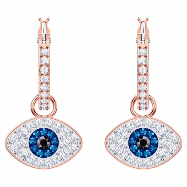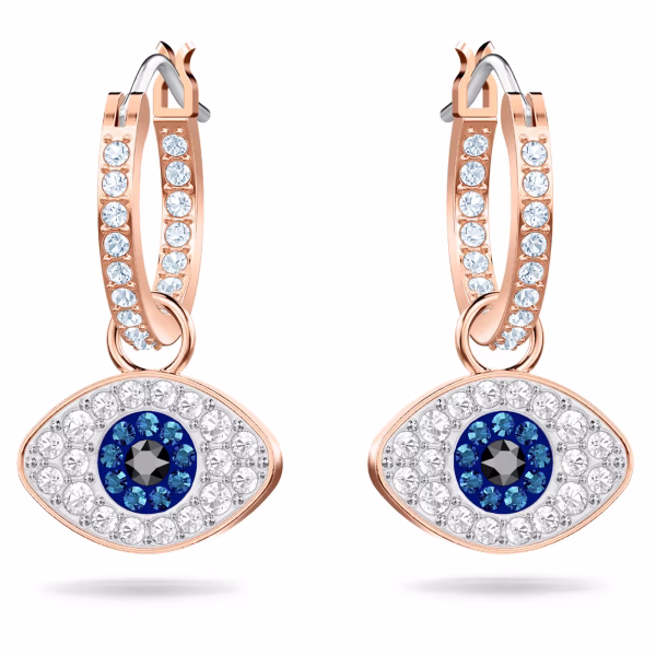 Подчеркните свой модный стиль с помощью этих универсальных сережек-колец с покрытием из розового золота. Они обыгрывают классический символ сглаза, украшенный прозрачным, синим и черным паве. Серьги крепятся на классические прозрачные кольца с паве, а мотивы глаза можно снять при желании. Они непременно добавят нотку изысканности и романтического гламура даже самому повседневному наряду.
