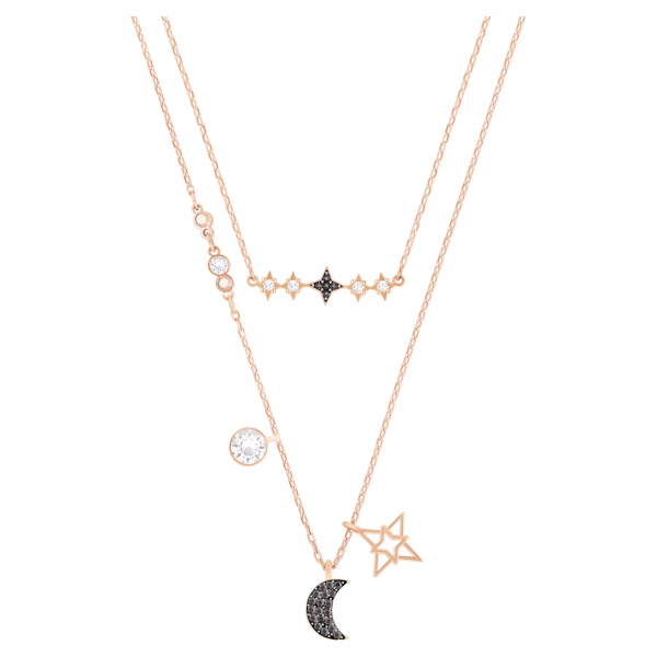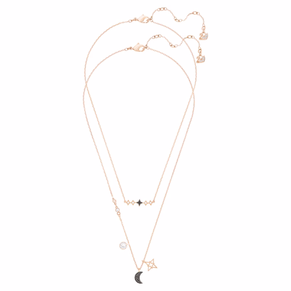 Элегантное украшение на каждый день для вашей коллекции. Их можно носить как вместе, так и по отдельности. В дизайне сочетаются различные металлические покрытия, а обе цепочки украшены прозрачными и цветными кристаллами. На более длинной цепочке свисают изящная металлическая звезда и луна, инкрустированные кристаллами.