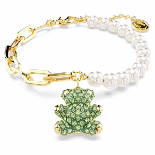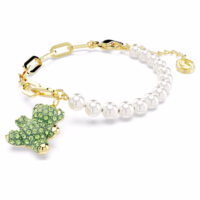 Этот сияющий браслет с плюшевым мишкой превращает любимого плюшевого мишку детства в роскошный предмет современного стиля. Трогательный мотив плюшевого мишки украшен зелеными кристаллами и надет на браслет из кристальных жемчужин Swarovski и позолоченную цепочку. Дополните свой комплект соответствующим ожерельем.
